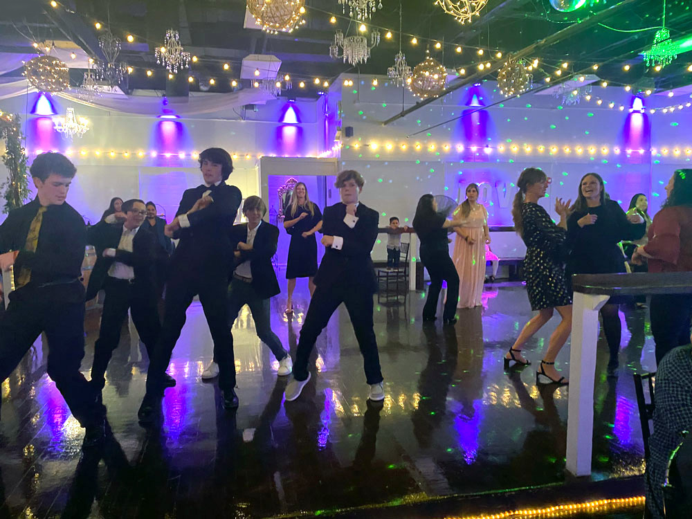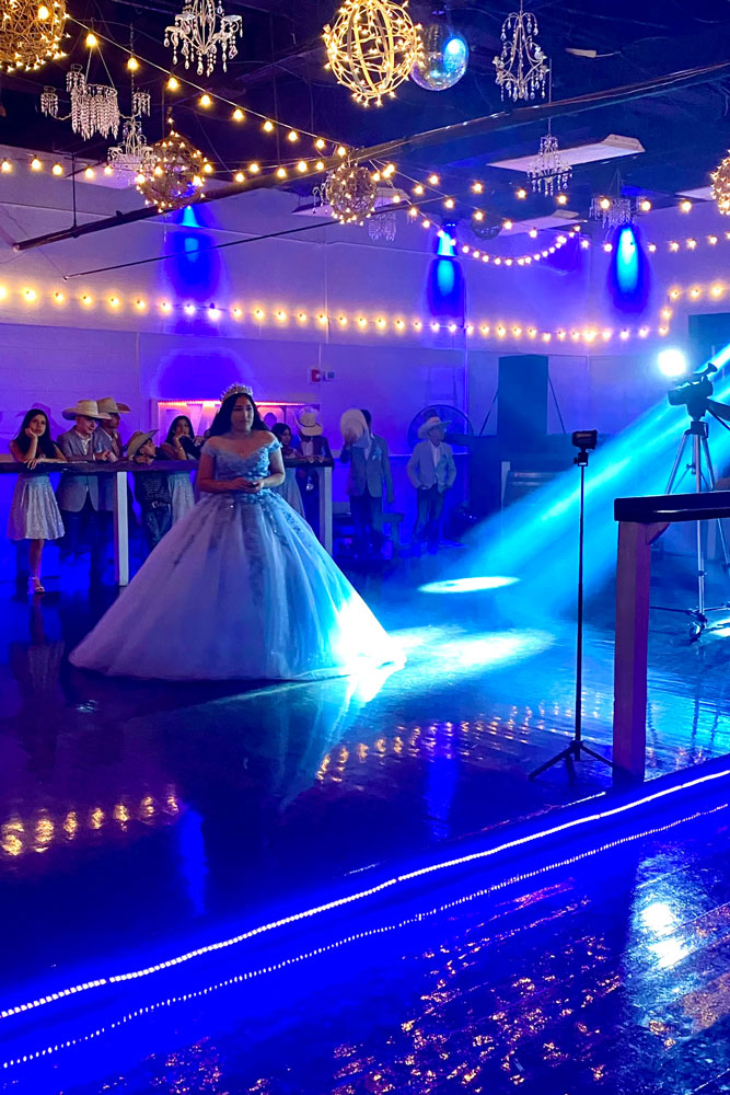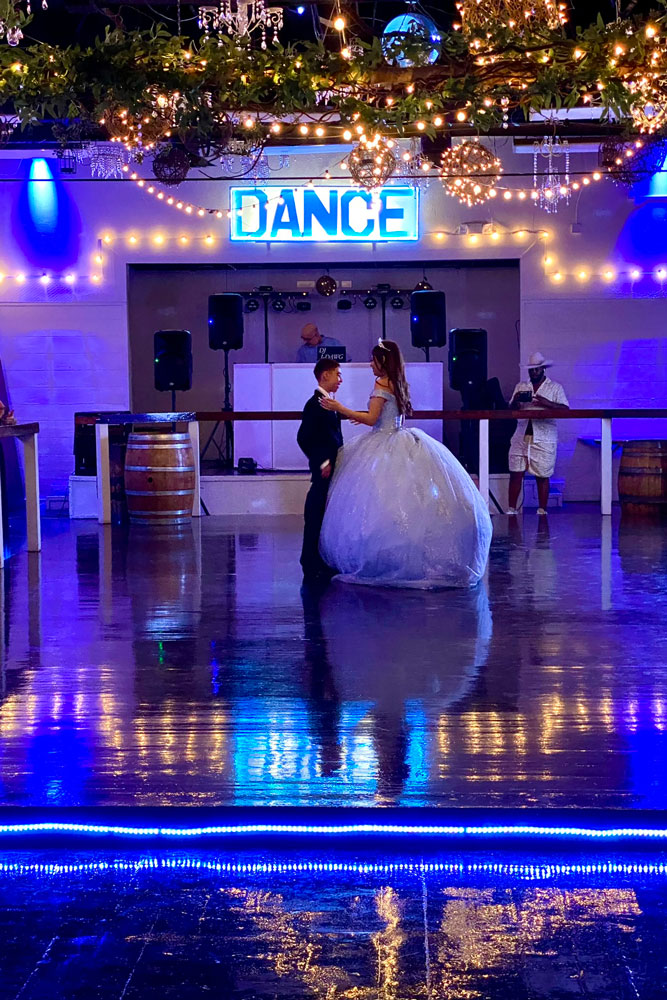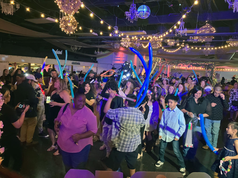 Our beautiful party lighting transforms the space with twinkling string lights, a shimmering mirrored ball, dance floor perimeter lighting, vibrant accent lights, and a color-changing “DANCE” wall sign—creating a lively, magical atmosphere that gets everyone moving.